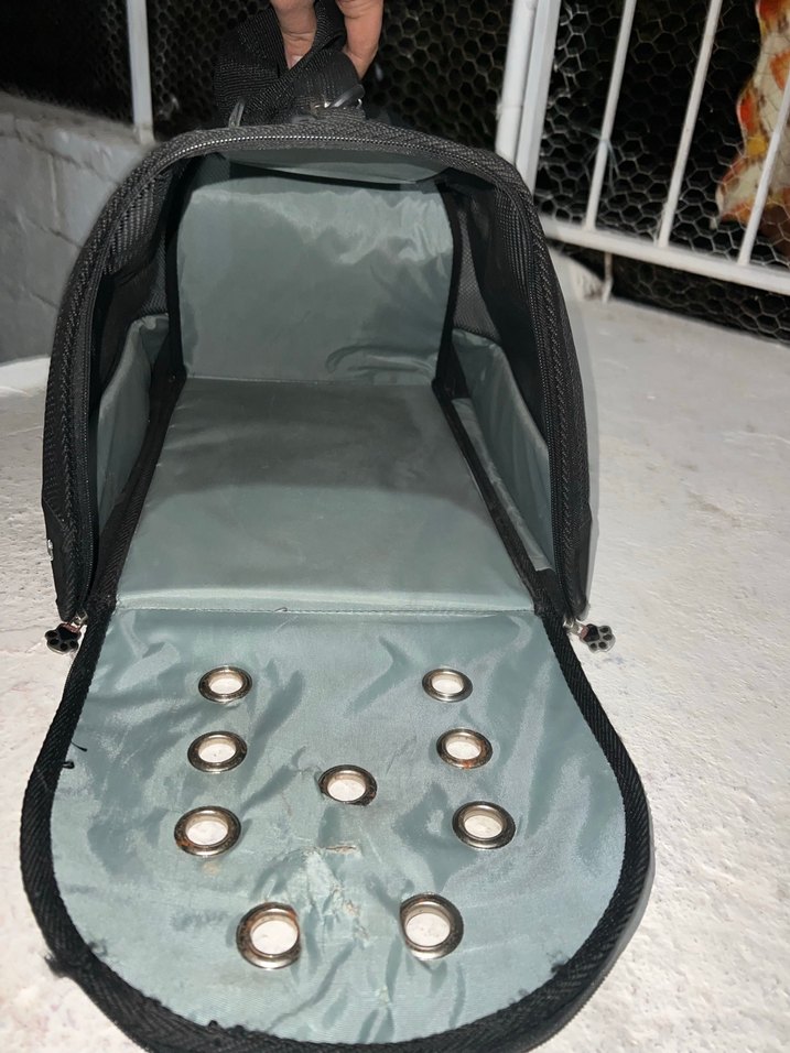 Siyah renkte, çok sayıda havalandırma deliği ve yumuşak iç yapısı ile evcil hayvanlar için taşınabilir taşıma çantasıdır sadece delikli kısımda küçük kedi tırnak izleri mevcuttur