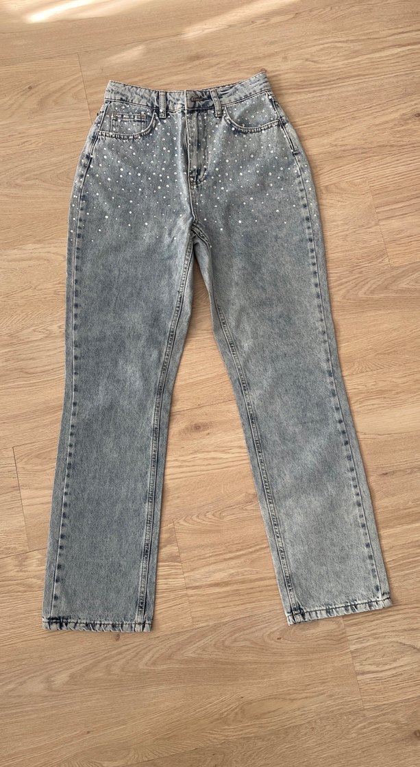 Hiç giyilmedi taşlı gri kadın kot pantalon