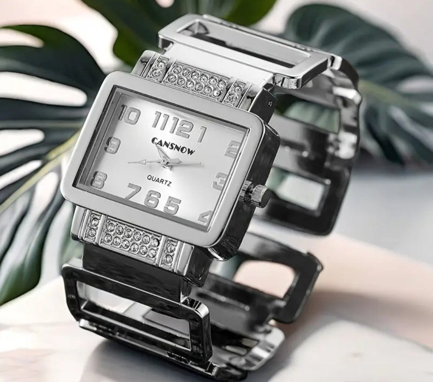CANSNOW markalı, gri taşlı bilezik ve kare kadranlı, kuvars mekanizmalı kadın kol saati. Klasik zarafetle modern tarzın birleşimi. ⌚