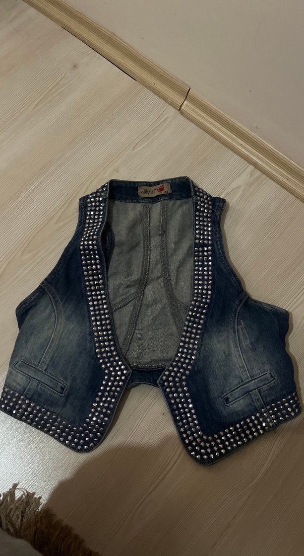 Gri renkli, kolsuz ve taşlı detaylı, düğmeli kısa kesim fitted denim yelek. Rock punk tarzına uygun rahat bir model.
