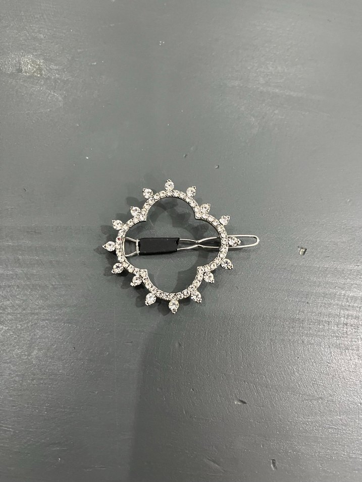 Gri metalden yapılmış saç tokası, minimal ve taşlı detaylarla sade bir gotik görünüm sunar. ✨