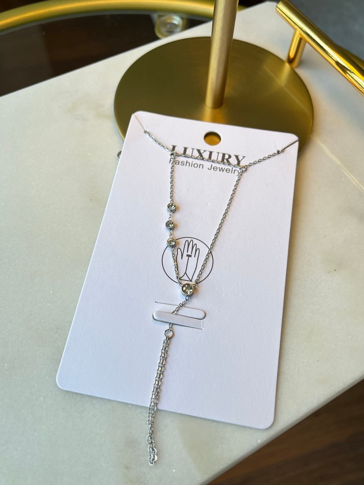 Gri renkli, zincir detaylı kadın el zinciri, minimalist ve çağdaş tarzda günlük kullanıma uygundur. Üzerinde 'Fashion Jewelry' ve 'LUXURY' yazıları vardır. ✨