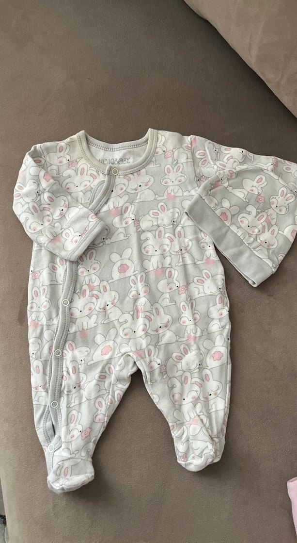 Yumuşak gri kumaşlı, tavşan desenli bebek kız tulumu, düğmeli ve uyumlu şapkalı, konforlu ve şık.