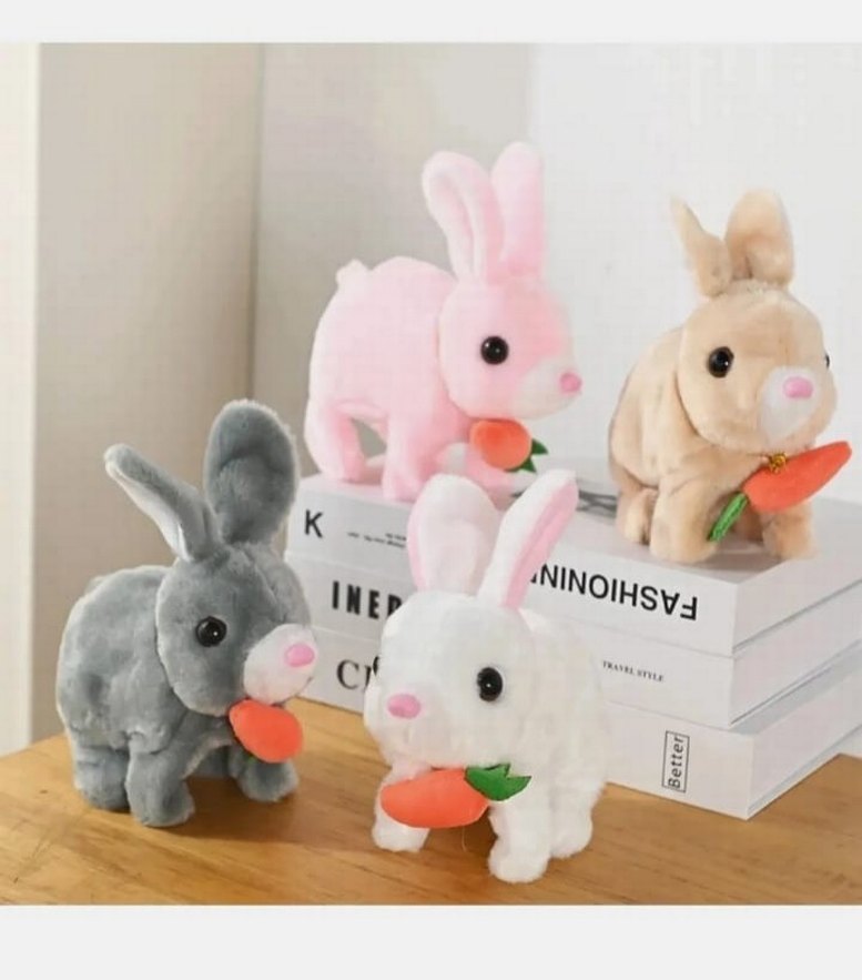 Yumuşak dokulu gri peluş tavşan, küçük bir havuç tutuyor. Nakışlı göz ve burun detaylarına sahip, sevimli bir oyuncak.