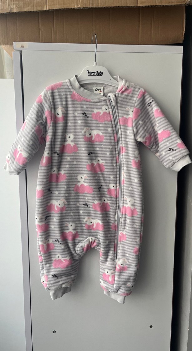 Gri zemin üzerine pembe tavşan desenleri olan, kolay giydirme için fermuarlı yumuşak ve rahat bebek uyku tulumu 2.5 tog hiç giydirmedim İstanbul’da havalar okadar soğuk olmuyor bir kere yıkandı