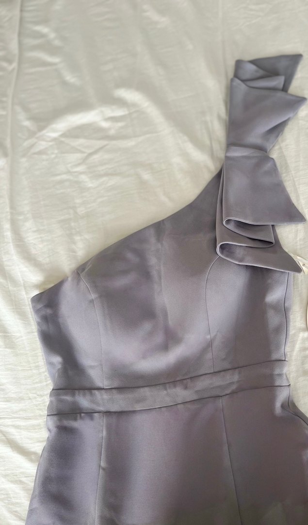 Astarlı, gri, tek omuzu fiyonklu, balık kesim abiye. Hem düğün kına hemde mezuniyet için kullanılabilir.