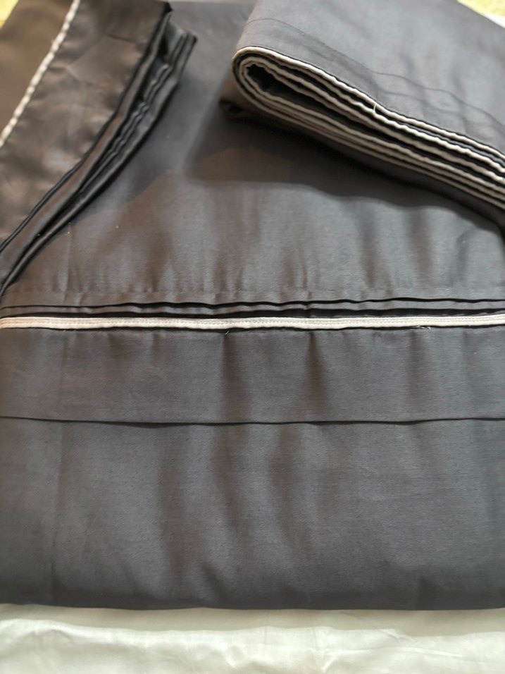Düz gri renkte, pürüzsüz kumaştan yapılmış nevresim ve çarşaf seti. İnce şerit detaylarıyla sade ve şık bir görünüm sunar 4 yastıklı