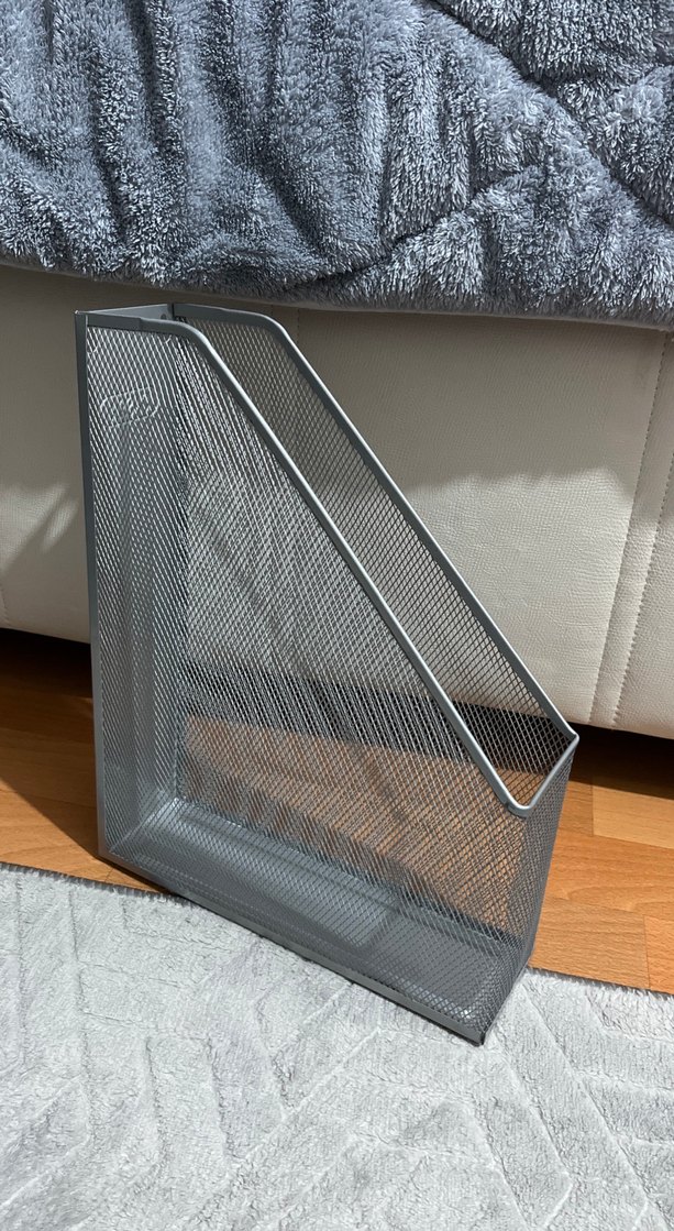Belgeleri ve dergileri düzenlemek için gri metal telden yapılmış dosya düzenleyici. İnce ve dik tasarımıyla masa veya raflarda kullanıma uygun. ️