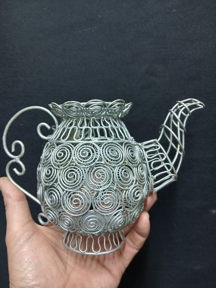 Gri telden yapılmış, spiral desenli dekoratif demlik.