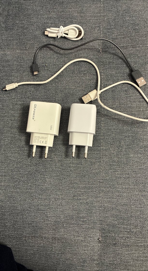 Gri renkli telefon şarj cihazları ve USB kabloları. Standart priz ve USB portları ile uyumludur. Günlük kullanım için uygundur.