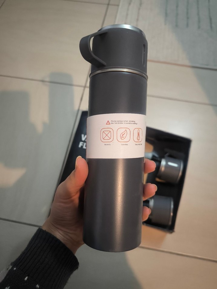Gri renkli termosu, içecekleri sıcak tutar ve kullanımı kolaydır. Güvenli kapaklı, ergonomik tasarımlıdır.