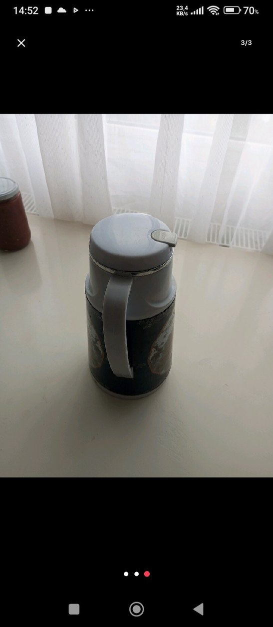 Gri renkli termos şişesi, sağlam tutma sapı ve kolay açılır kapakla donatılmıştır. İçecekleri uzun süre sıcak tutar.