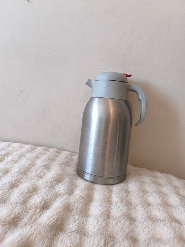 Gri renkte, sağlam saplı ve kapaklı termoslu çaydanlık. Çayın sıcak kalmasını sağlar, modern ve kullanışlı tasarıma sahiptir.
