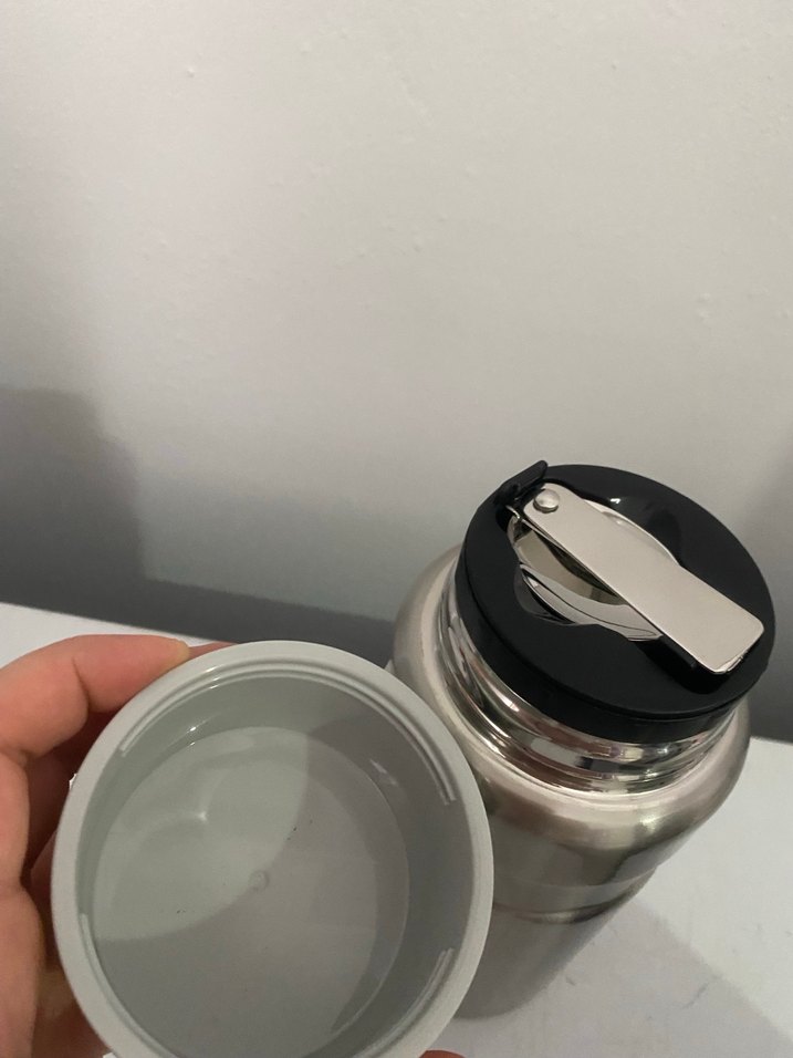 Gri renkli termosu, güvenli kapak ve çıkarılabilir bardak ile sıcak içecekler için uygundur.