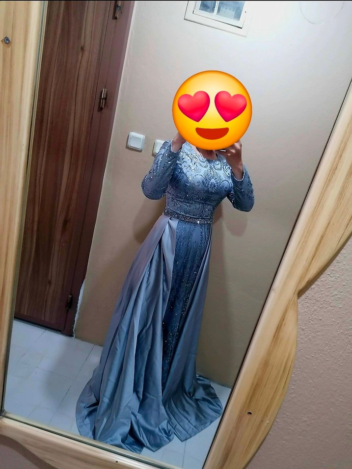 Yüksek yakalı, uzun kollu, baskılı desenli, drapeli ve oturan kesimli uzun gri abiye elbise. Düğün ve özel anlar için uygun, mütevazı gotik tarzda.