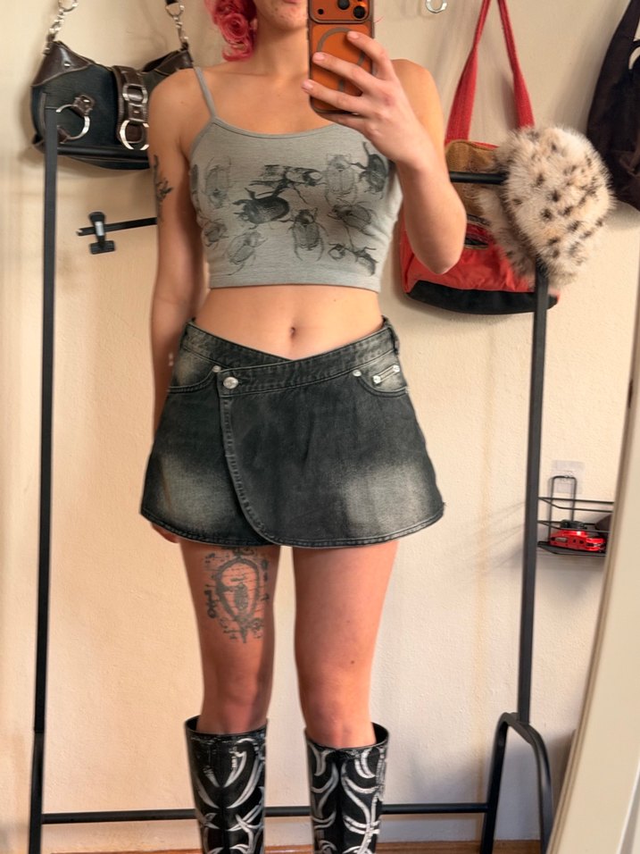 Gri denim mini etek, fitted kesim ve tie-dye desenle grunge punk tarzını yansıtır, günlük kullanıma uygundur. Bana artık büyük geldiği için satıyorum.