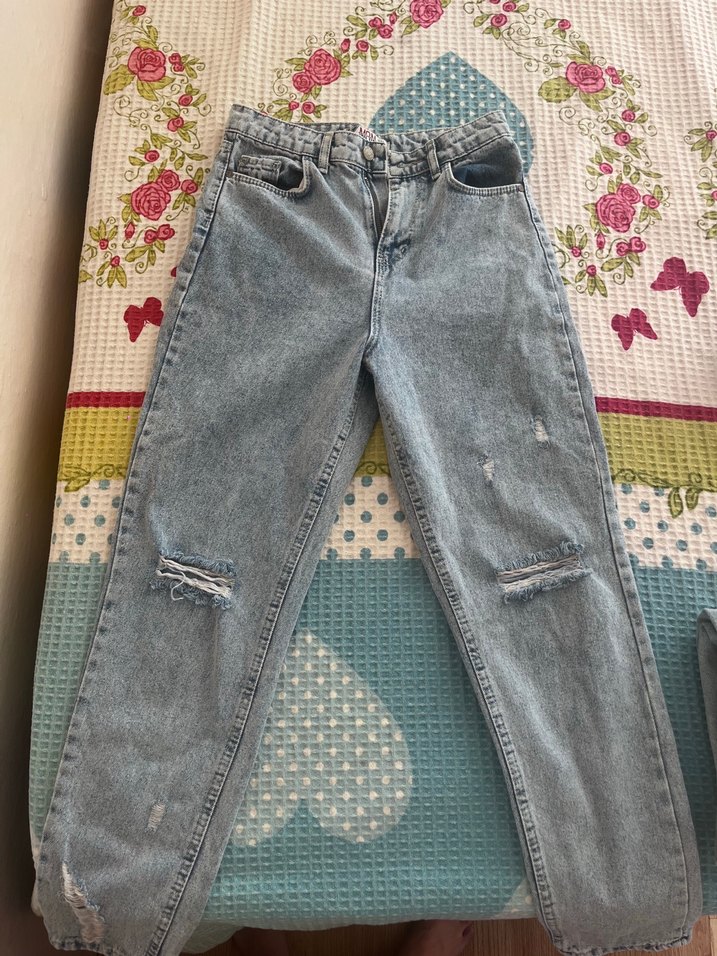 Gri tie-dye desenli, bol kesim, midi boy kadın denim jean, tokalı detaylı, günlük rahat sokak stili için uygun.