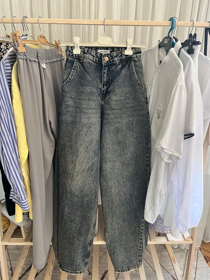 Gri tie-dye desenli, bol kesim ve normal boy kadın jean. Rahat ve şık sokak stili için uygundur.