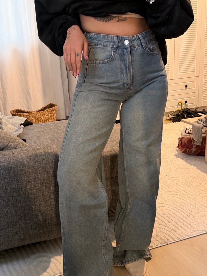Salaş kesim, gri tie-dye desenli midi boy kot pantolon. Günlük kullanım için rahat ve şık bir sokak stili sunar.