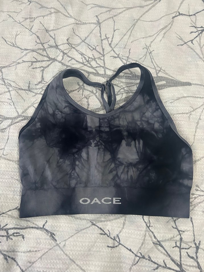 Gri tie-dye desenli, kısa boy spor sütyeni. Streetwear tarzında ve OACE logosu bulunur.