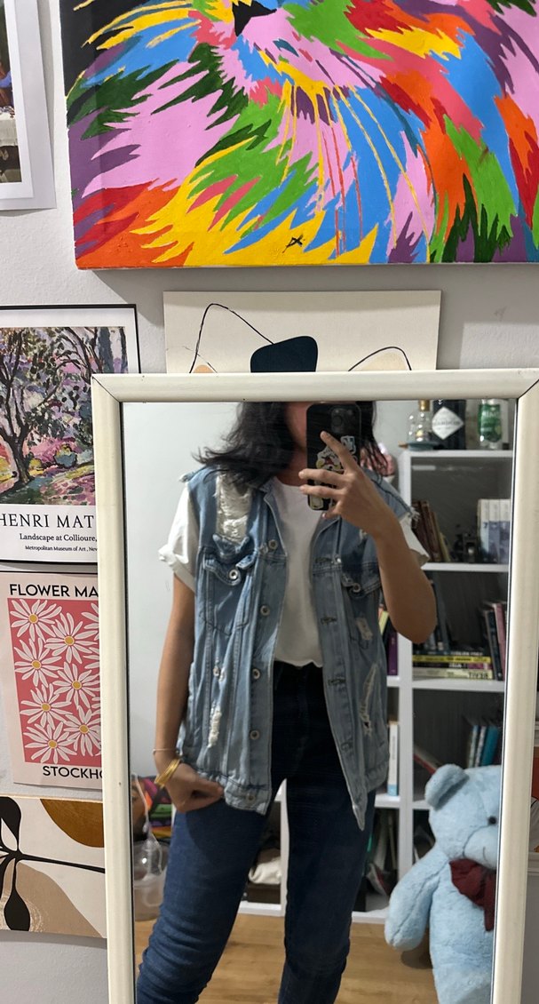 Açık mavi yırtıklı, bol kesim, kolsuz denim yelek. Defosu yok ama çok giymişimdir.