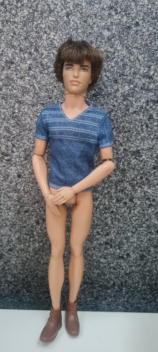 Çizgili gri tişört giymiş, eklemli kollara sahip erkek bebek oyuncak. Gerçekçi yüz hatları bulunur.