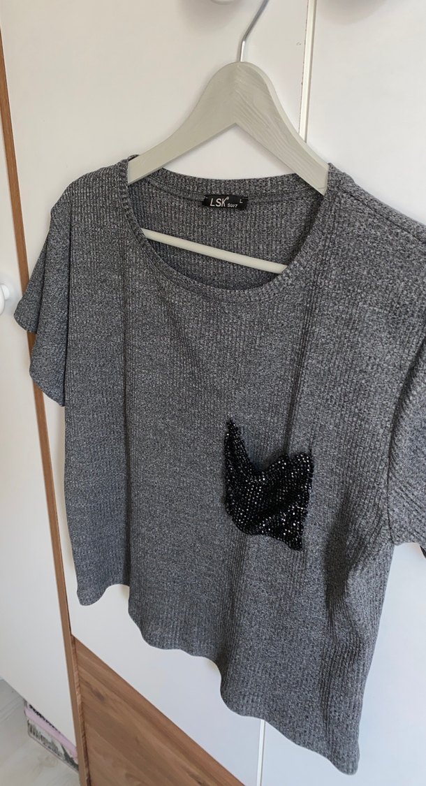 çok şık bir bluz l beden cep taşlı kısımda minik bir delik var ama taşlar yığıldığı için asla belli olmuyor ben yine de belirtmek isterim Gri tişörtü; yuvarlak yaka, kısa kollu, bol kesim ve kısa boyludur. Siyah pul işlemeli küçük cep detayı bulunur.