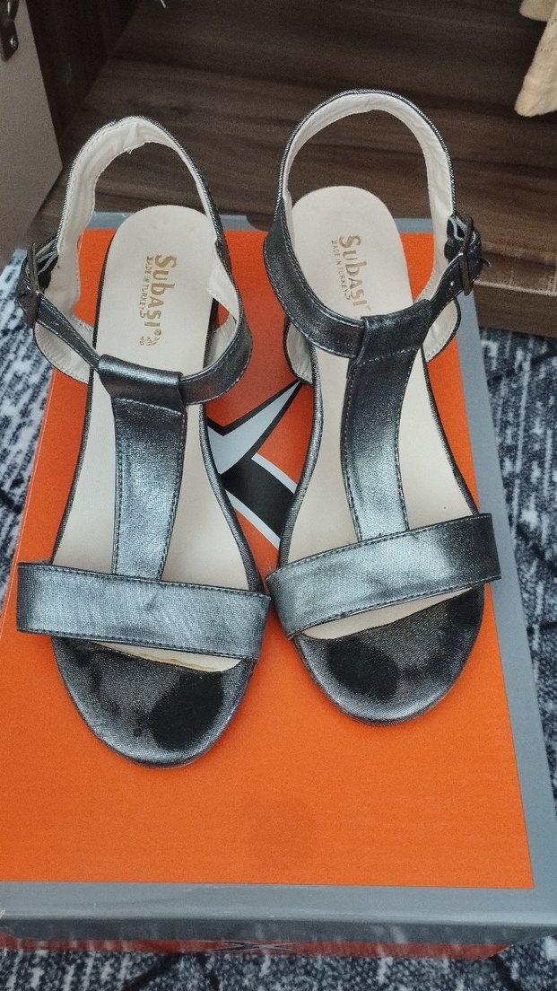 Gri renkte, toka detaylı ve yılan derisi desenli blok topuklu kadın sandalet. Kauçuk malzemeden, günlük ve sokak stili için uygun. 2 DEFA GİYİLDİ DÜĞÜNDE