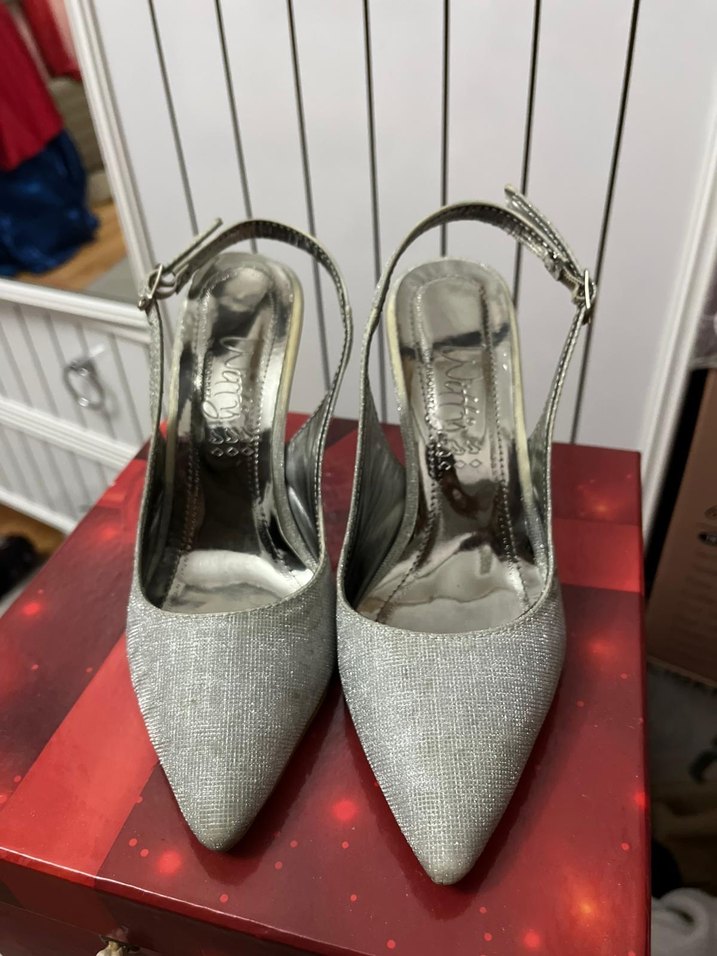 Gri, tokalı ince topuklu, metal görünümlü ve desen içermeyen abiye ayakkabılar, düğün için uygundur.