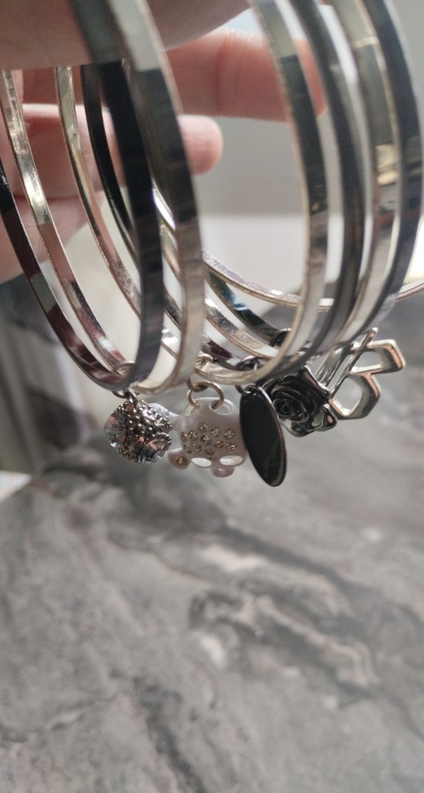 Gri tokalı, çeşitli figürlü çağdaş kadın bileklik seti, günlük kullanıma uygun ve göz alıcı bir tarz sunar.