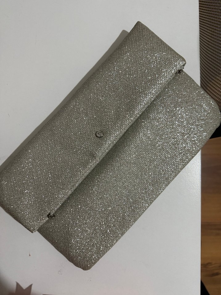 Gri renkte, tokalı ve sentetik kumaştan yapılmış kadın clutch çanta, minimalist ve çağdaş ofis stiline uygundur.