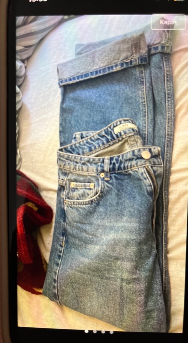 Gri tokalı, midi boy, bol kesim kadın jean. Denim kumaştan, açık mavi tonunda ve günlük sokak stiline uygun.