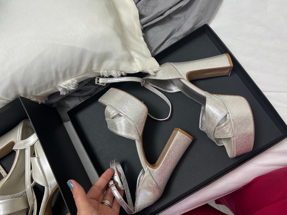Gümüş topuklu ayakkabı düğün için aldım giymedim dayanıklı malzemeden üretilmiş ve düz yüzeye sahip, modern kullanıma uygun.