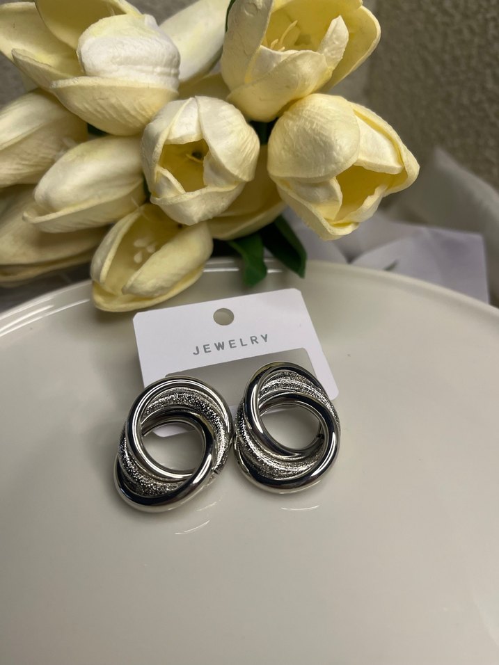 Gri renkte, tokalı kısa uzunlukta, minimalist küpeler. Düğünler için uygun, klasik zarafeti yansıtan hafif desenli Düz ve simli gri iç içe geçmiş halka halkadır