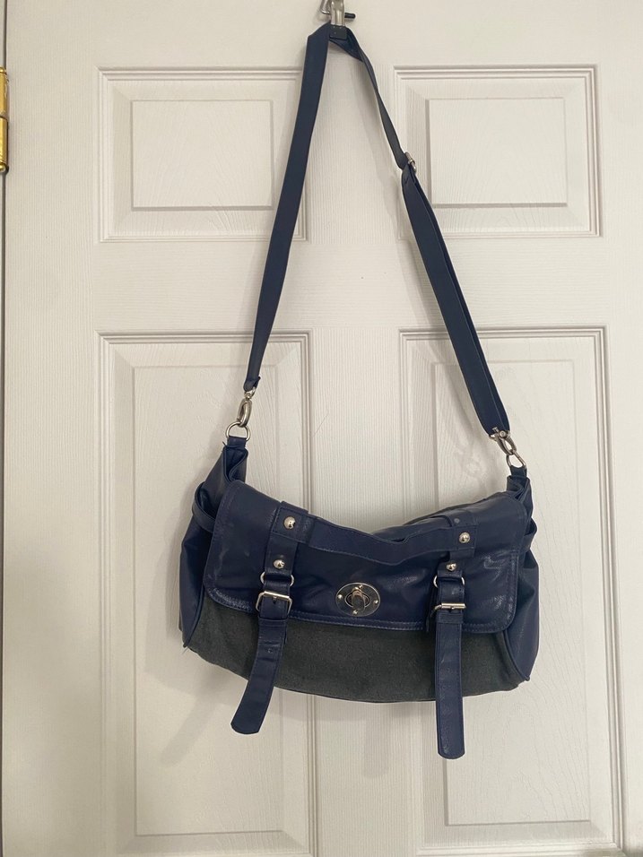 Gri tokalı, ayarlanabilir askılı lacivert denim kadın çanta, günlük sokak stili için uygun. Temiz ihtiyaç fazlası ürün