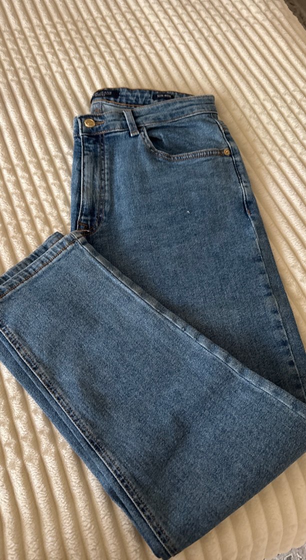 Gri tokalı, düz desenli mavi denim pantolon. Normal boy ve regular fit kesime sahip, günlük sokak stili için uygundur.