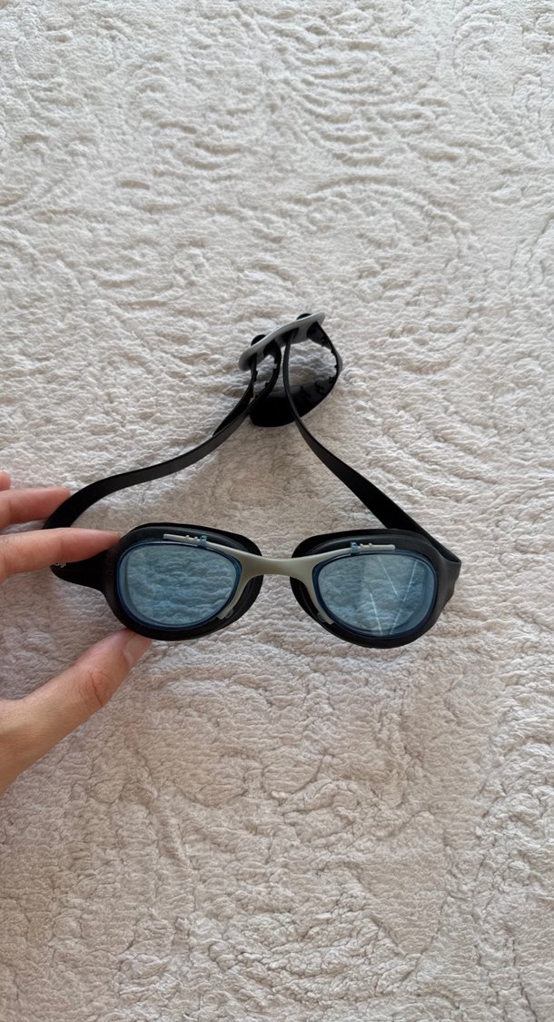 Tokalı kayışa sahip, gri renkte, minimalist ve gotik tarzda yüzücü gözlüğü. Plajda kullanıma uygun, vücuda oturan tasarım. ️