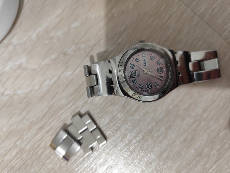 Pembe kadranlı, gri tokalı vintage tarzı kadın kol saati. Tarih göstergesi ve klasik tasarıma sahip.
