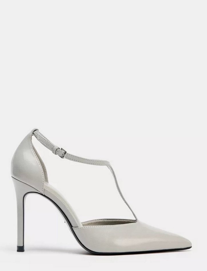 Beyaz, tokalı stiletto topuklu ayakkabı, metal detaylı, minimalist ve çağdaş tasarıma sahip, ofis kullanımı için uygun.