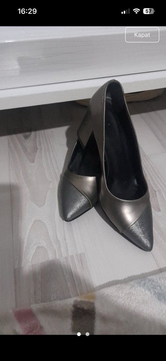 Gri renkte, tokalı ve kauçuk malzemeden yapılmış stiletto topuklu kadın ayakkabısı. Ofis kullanımı için uygun, şık ve çağdaş tasarım.