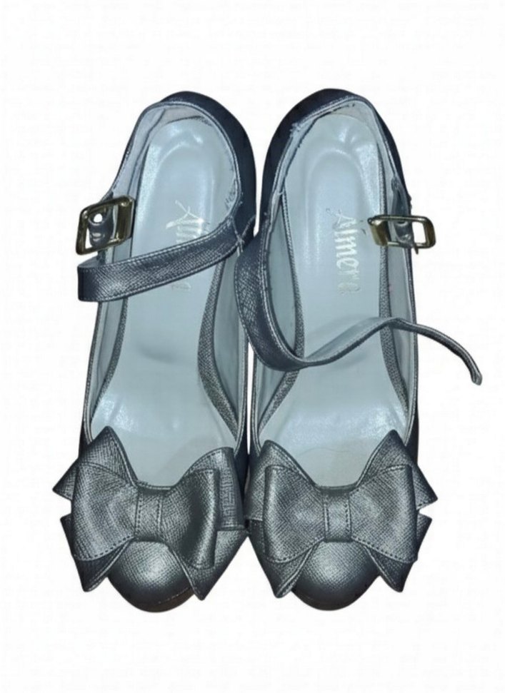 Gri tokalı ve fiyonk detaylı stiletto topuklu, kauçuk malzemeden yapılmış kadın ayakkabısı. Avant-garde tarz ve düğünler için uygundur.