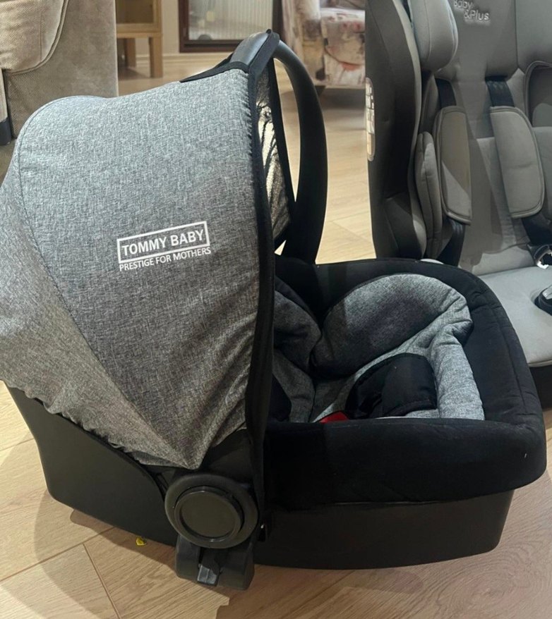 Tommy Baby marka gri bebek oto koltuğu, yumuşak kumaşı ve koruyucu tente ile bebeğiniz için rahat ve güvenli bir yolculuk sağlar. yeni gibidir