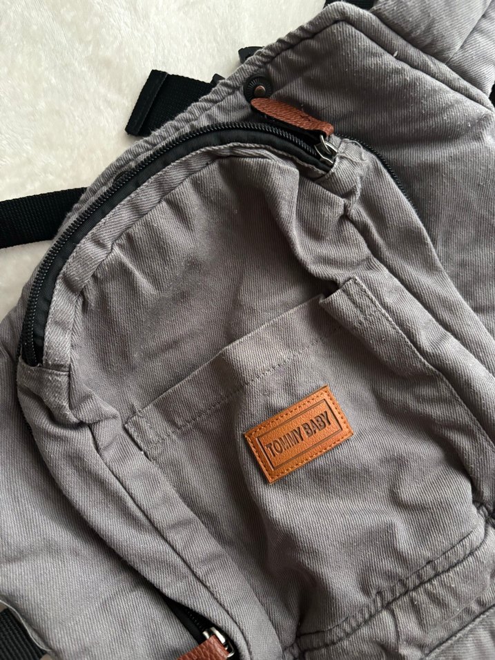 Yumuşak kumaştan gri Tommy Baby bebek taşıyıcı, kullanışlı fermuarlı ceplere sahip. Rahat ve pratik bebek taşıma ürünü. Ürünü cok az kulladım kusurları sadece hafif tüğlenme