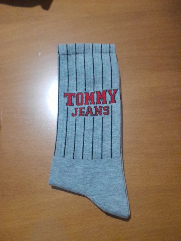Dikey çizgili ve kırmızı Tommy Jeans logosu baskılı gri, normal uzunlukta, erkek çorabı. Rahat ve şık midi boy çorap.