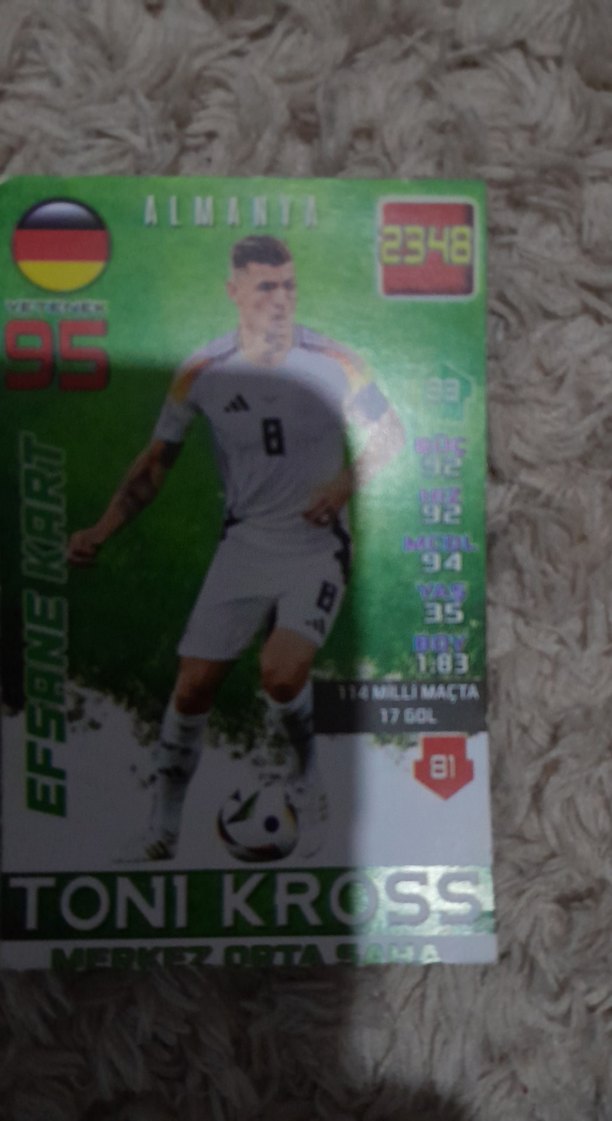 Toni Kroos'un detaylı istatistikleri ve Alman bayrağı bulunan gri erkek rozeti. Oyuncunun pozisyonu ve başarılarını gösterir. ⚽