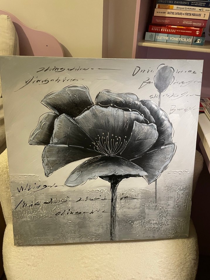 Gri tonlarda büyük bir çiçek ve el yazısı detayları içeren dokulu bir tablo. Çiçek ve yazı temalarını bir araya getirir.