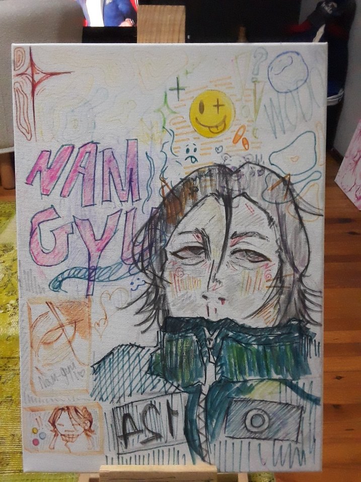 Gri tonlarda soyut çizim ve yazılar içeren, yüz ve gülen yüz gibi karalamalarla zenginleştirilmiş bir tablo. Hafif renkler ve karışık teknikler kullanılmış.
