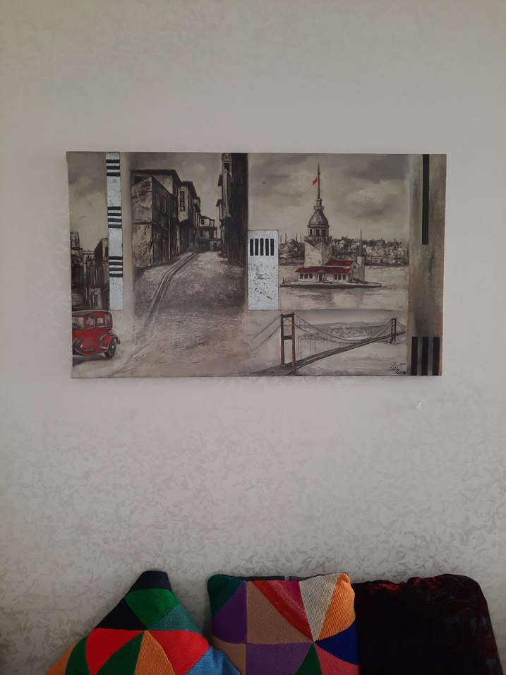 Gri tonlarda İstanbul'un tarihi sokakları, Kız Kulesi ve köprü gibi simgelerini içeren tablo. baksı üzerine çalışma
