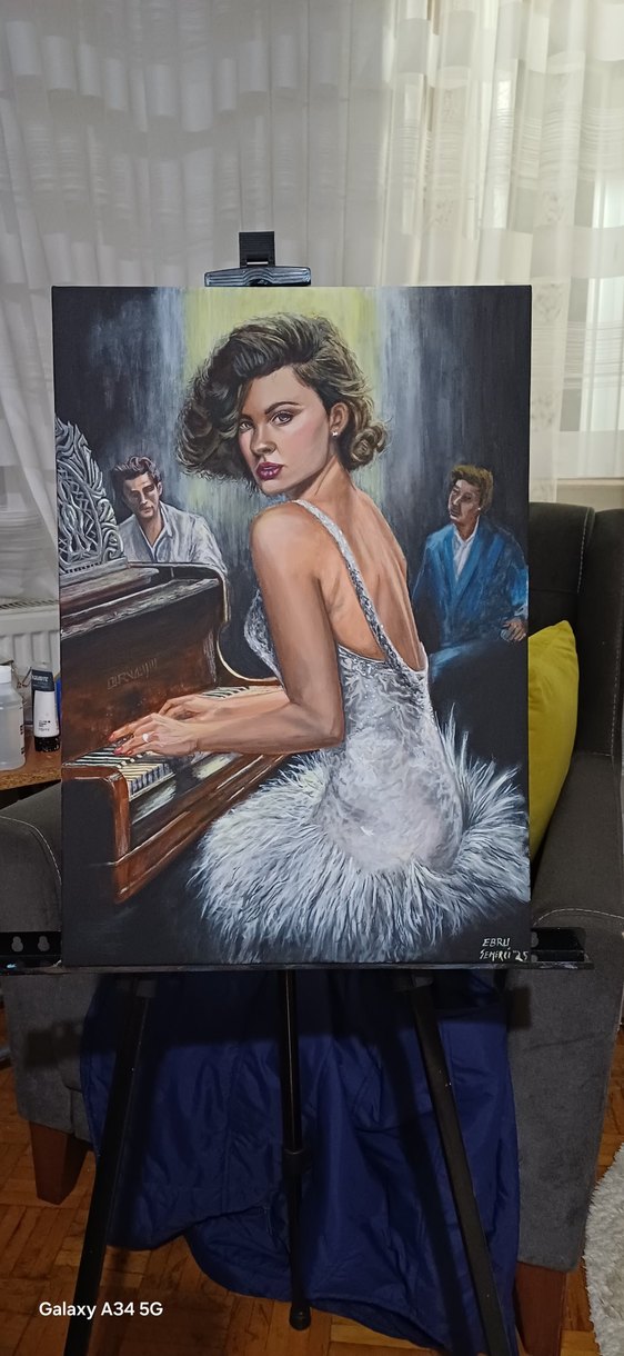 Gri tonlarda, beyaz elbiseli bir kadının piyano çaldığı ve arka planda iki erkeğin olduğu akrilik boya tablo. 35×50 tuval üzerine akrilik boya çalışmam.