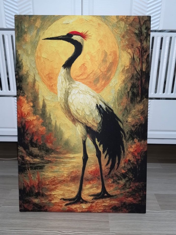 Gri ve koyu tonlarda, büyük parlayan ay ve sisli orman arka planında bir leylek figürü yer alan tablo. ️ Kanvas tablo dijital baskı 50x70 cm güncel stokta var #tablo